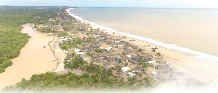 Currently, the sea has reduced the village into a small strip of land sandwiched by the high tides and swelling lagoon as well as the River Pra.
